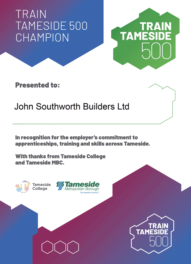 We’re proud to have been recognised as a Train Tameside 500 Champion, celebrating our ongoing commitment to apprenticeships, training and skills development across the borough.